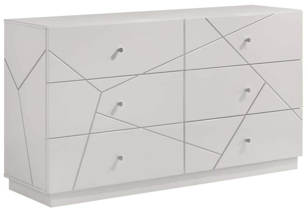 The Esther dresser features a white and silver high gloss finish, six drawers, and a modern geometric design. Elegant and contemporary, it brightens bedrooms with luxe style and subtle illumination.Read More