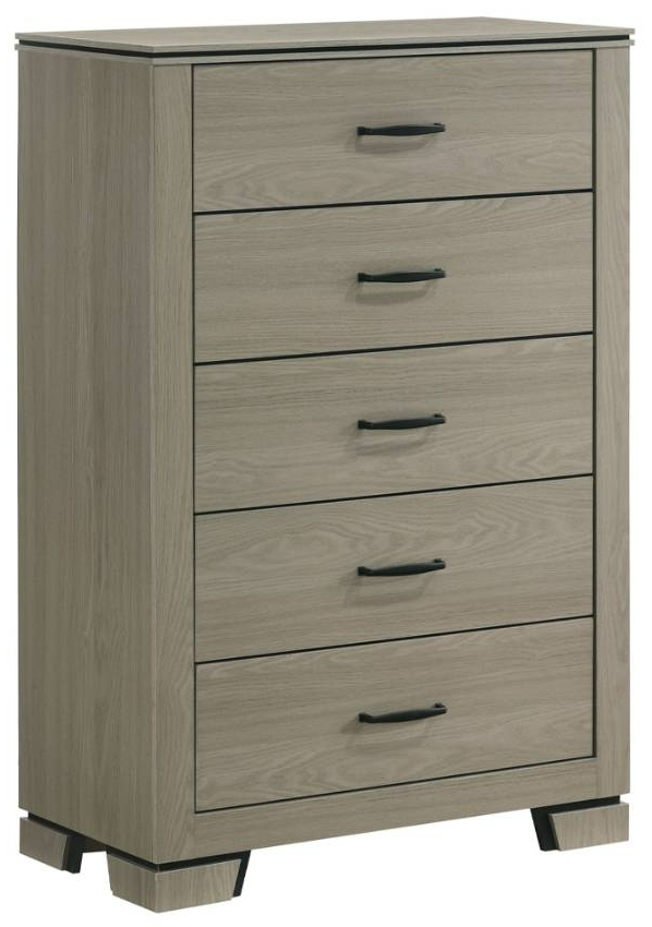 The Joanna chest features a sleek weathered gray finish with five smooth-glide drawers, durable wood and composite construction, anti-tip hardware, and classic design. Compact and functional, it adds organized storage and timeless style to any bedroom.Read More