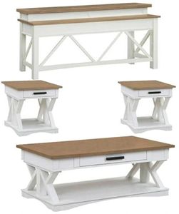 Crafted in a soft cotton white finish, this set features a contrasting wood-grain top in weathered natural. A lower open area is perfect for storage and display, while a center drawer and crossbeam design touches give it endless appeal.Read More