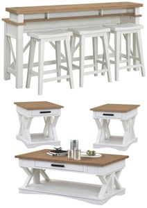Crafted in a soft cotton white finish, this set features a contrasting wood-grain top in weathered natural with matching stools. A lower open area is perfect for storage and display, while a center drawer and crossbeam design touches give it endless appeal.Read More