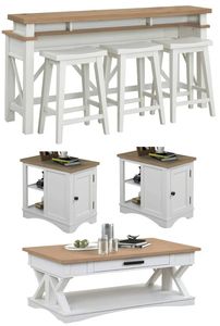 Crafted in a soft cotton white finish, this set features a contrasting wood-grain top in weathered natural with matching stools. A lower open area is perfect for storage and display, while a center drawer and crossbeam design touches give it endless appeal.Read More